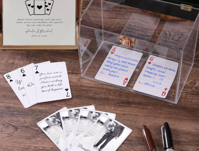 Custom playing cards make an unforgettable wedding guest book—fun, personal, and something you’ll actually keep forever. Instead of signing a traditional book that sits on a shelf, your guests write their messages, well-wishes, and advice directly onto individual cards that you can play with afterwards. It’s interactive, unique, and the perfect way to add a playful touch to your big day